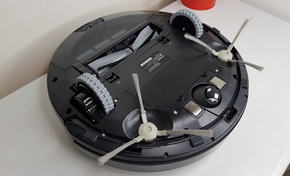 En bas, il y a 3 autres paires de capteurs de détection de hauteur. En conséquence, ce robot aspirateur détecte les escaliers dans les chalets et les maisons.Pour la maniabilité, des roues d'assez bonne qualité sont responsables. Amortisseur arrière. En général, il n'est pas nécessaire de s'inquiéter de surmonter les petits obstacles. De plus, il y a deux brosses latérales et une brosse principale en dessous, qui peuvent être retirées et nettoyées des débris sans trop d'effort. À proximité se trouvent les contacts pour connecter la station de charge. Par conséquent, vous pouvez charger la batterie (2600 mAh) de deux manières.