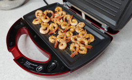 Crevettes d'abord. Nous avons chauffé les panneaux pour les préparer, disposé les fruits de mer et fermé le couvercle. Comme prévu, il n'y a eu aucun problème avec ce plat. Après 10 minutes, les crevettes étaient recouvertes d'une croûte dorée. Il a l'air délicieux et le goût correspond à l'image.
