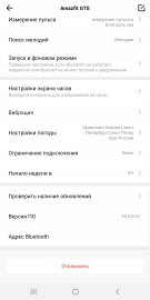 L'écran de 1,65 pouce est construit sur une matrice OLED avec une résolution de 348 par 442 pixels avec une densité de 341 PPI. L'écran protège le verre 2.5D Corning Gorilla 3 de haute qualité. Une petite lunette de 3,5 mm est visible sur les bords.Il convient de noter que l'écran est lumineux et que l'image est claire même avec la lumière directe du soleil. Le capteur de lumière fonctionne correctement. Je suis heureux que le niveau de luminosité soit contrôlé automatiquement: en douceur sans secousses, ce qui est typique des modèles économiques. Selon le fabricant, le boîtier peut résister à une immersion jusqu'à 50 mètres à une pression de 5 atmosphères.