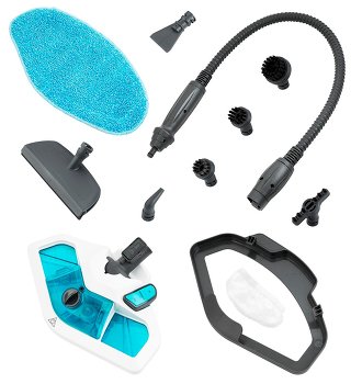 - Buse vapeur - nécessaire pour connecter une brosse en tissu (pour les vêtements et les rideaux) et un grattoir en caoutchouc (pour les miroirs et les verres);
