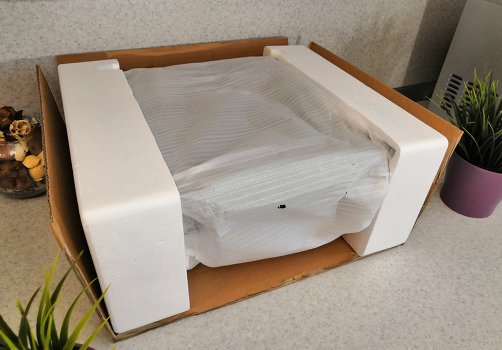 Sur la base des images sur la boîte, vous pouvez vous familiariser avec les principales caractéristiques de l'appareil, qui sont présentées sur la face avant - une indication du degré de friture, déterminant l'épaisseur du steak et l'ouverture à 180 degrés. Immédiatement frappé par l'image et l'inscription "vraiment des frites". En ouvrant le paquet, dans la boîte, j'ai trouvé une unité de 4,5 kg, emballée professionnellement.