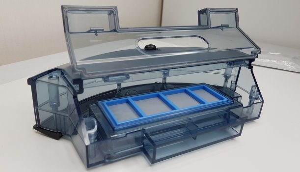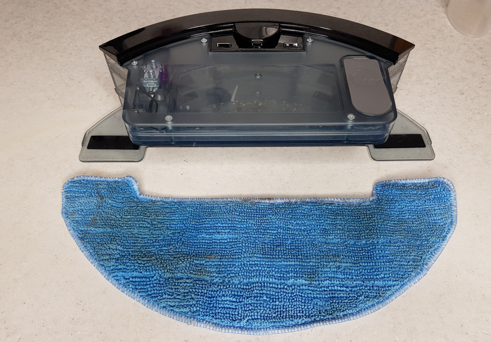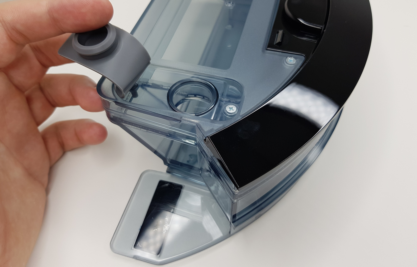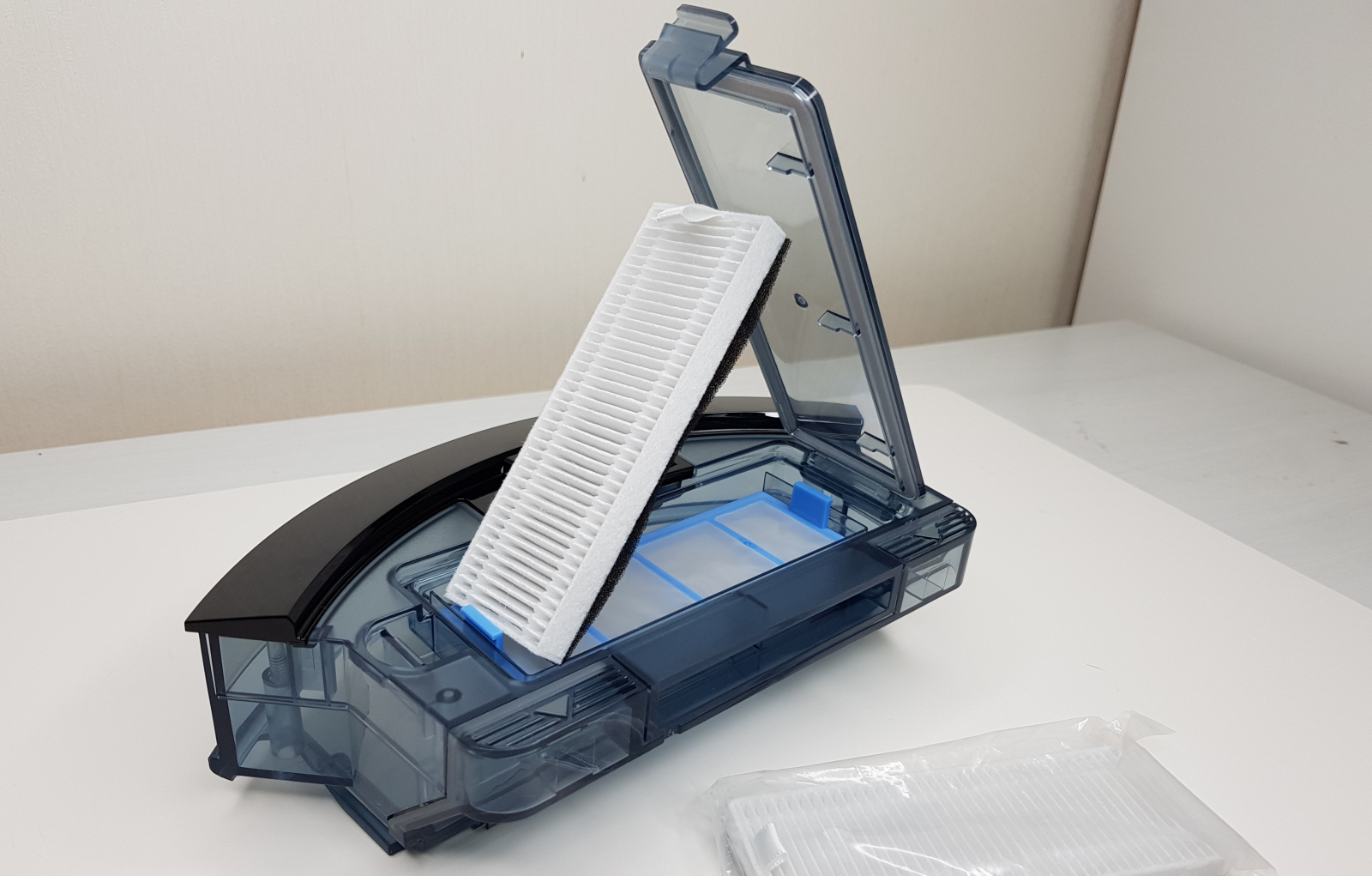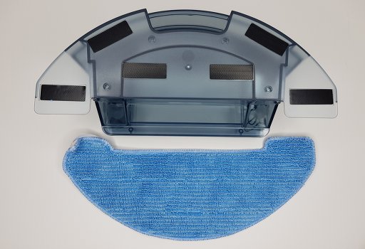 To carry out wet cleaning, another container with SMART DRIP 2.0 technology is used. The function is responsible for the uniform flow of water. Microfiber is attached from below. If the robot cleaner stops moving, the water supply is cut off.