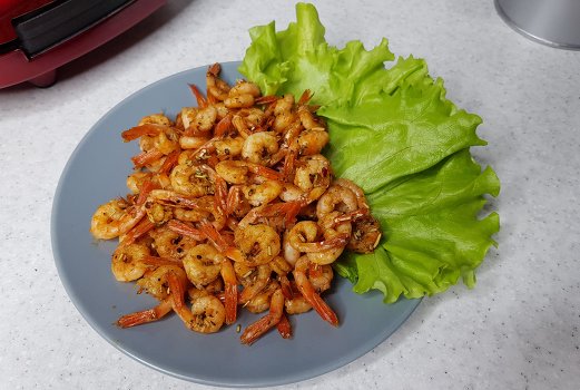 Shrimp first. Heated the panels until cooked, laid out seafood and closed the lid. As expected, there were no problems with this dish. After 10 minutes, the shrimp covered with a golden crust. It looks appetizing, and the taste matches the picture.