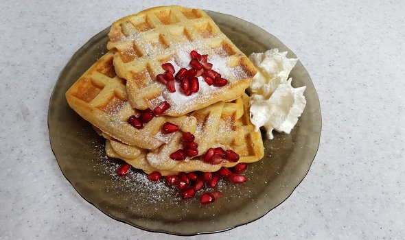 Next, a dessert was prepared using panels for Viennese waffles. The photo shows the final result perfectly. The waffles turned out to be quite soft, tasty - they were not burnt anywhere. The result is completely satisfied.