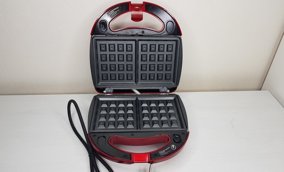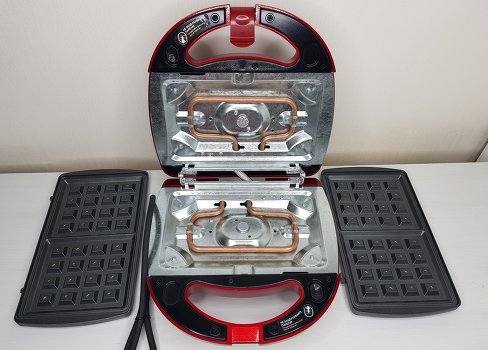 The panels are made of non-stick aluminum alloy. Underneath are open heating elements. Dimensions are 21.5 by 13 centimeters. An oil and grease tray is installed under the base of the device.
