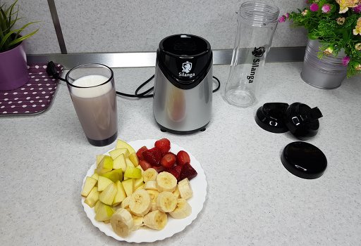 Before using the device for the first time, we washed the bottles under tap water using detergents. Thoroughly washed the containers and started testing. You cannot use a smoothie shaker without ingredients. Keep in mind!