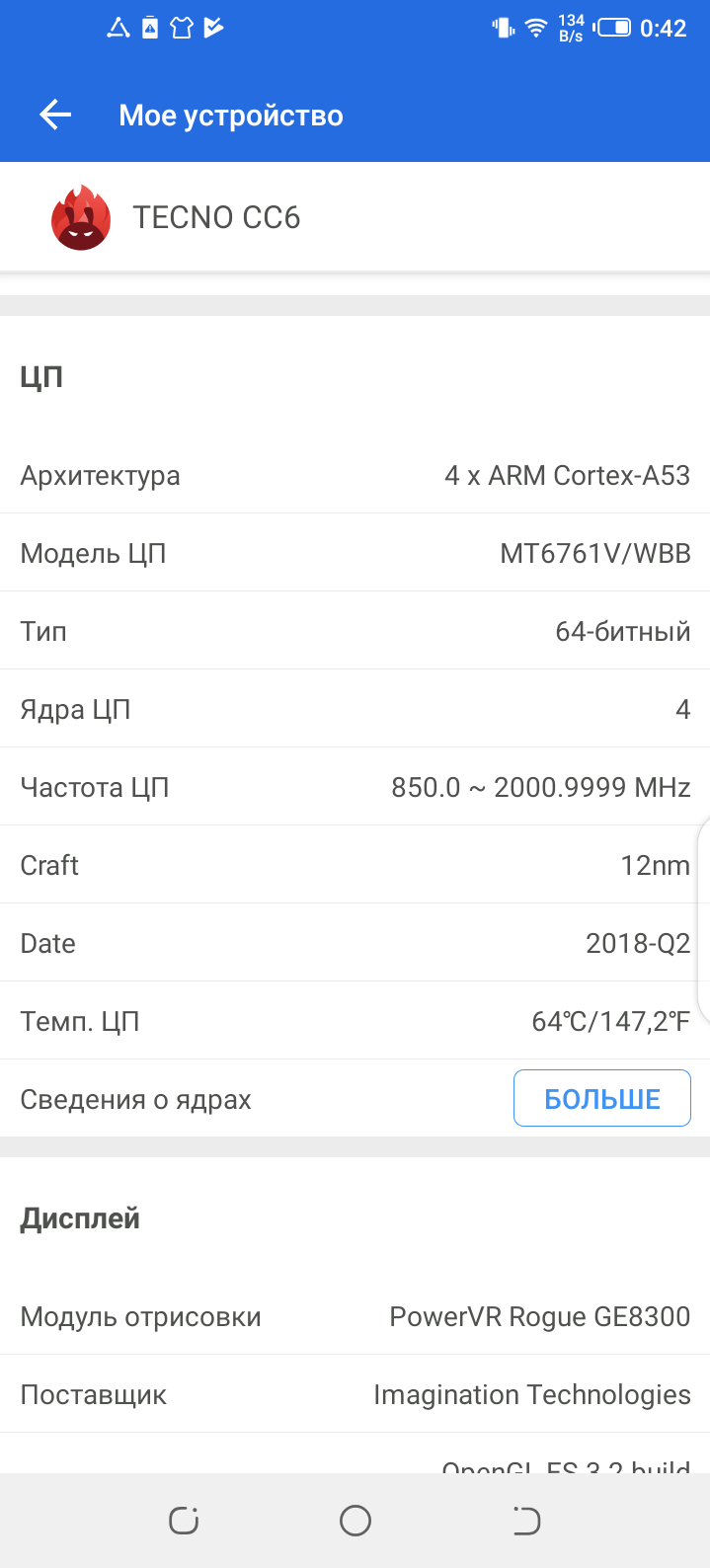 Is there much to say about the power of a budget smartphone worth up to 10 thousand rubles? The model is based on the MediaTek Helio A22 processor with 4 cores, the frequency of which is 2.0 GHz. As in the case of TECNO POP 2S, there is enough performance to open several simple applications and surf the Internet quietly. Naturally, this is not a gaming smartphone and it will not pull 3D games, you can not talk about this, but just in case. Scrolling the content displayed in the browser is not accompanied by freezes, twitching of the picture - the state employee copes well with its tasks. For interest, we decided to check the power indicators in the Antutu test, but the phone could not be found in the benchmark database. A similar story was with the previous model, which came to our review. The resource gives a different name for the smartphone. It is worth adding that the model is not very hot. Last time I was convinced that the company does not save on thermal grease.