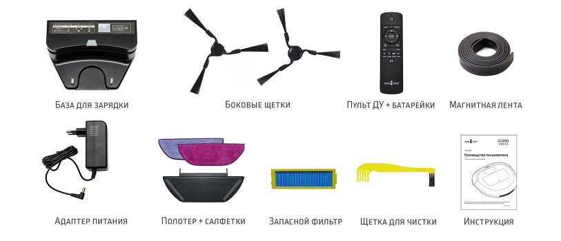 - Base - a device for charging a robot vacuum cleaner that performs its task in 180 minutes;