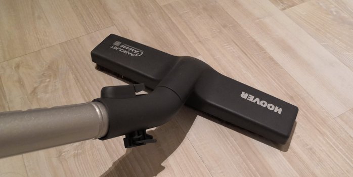 The effectiveness of the model was tested on different coatings. I was embarrassed that after switching on I felt a slight smell of rubber - I was alerted. However, this fragrance quickly disappeared. Power is 2400 W, so you should not expect that the device will work quietly. Started with parquet, then cleaned in the hall, kitchen and bathroom. As part of the tests, Hoover ATHOS found out that this model copes with a rather difficult task - cleaning garbage from the carpet. Similarly with small rugs in the bathroom. In the picture above you can see what the main nozzle of the vacuum cleaner looks like, and below the turbo brush and brush for parquet.
