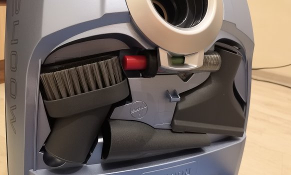 The first impression of the design of the vacuum cleaner is positive, although it is very large. The model weighs 6.7 kilograms, but it is easy to transport to different rooms thanks to the movable wheels. Telescopic tube made of metal. The case is made of glossy plastic. Thanks to the Nanopack system it is possible to twist a flexible hose around the vacuum cleaner, the tube can be stored in the grooves in the back of the vacuum cleaner. The power cord is automatically rewound. For three additional nozzles there is a special storage compartment, and this is probably the only thing that distinguishes it from other models.