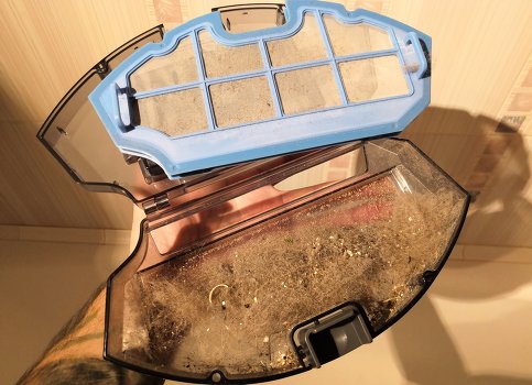 Based on the test results, we can conclude that the sensors work well - obstacle avoidance is effective, in addition, the bumper has an effective rubber shock absorber. Problems arose only when cleaning under the table: because of the thin legs of the chairs there were slight difficulties with the passage of the zone. But the blows are not significant, and the apparatus sorted out this mess quite quickly. It is worth adding that I have a cat in my apartment, so a lot of wool is collected in hard-to-reach places. I liked that the device perfectly cleans along the walls, which can be seen, in fact, by the amount of garbage in the dust collector.