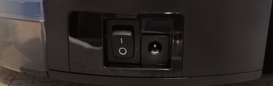 The on / off button for the robotic vacuum cleaner is located on the side between the container and the bumper. Nearby is a hole for connecting charging. In parallel, on the other hand there is an air vent.